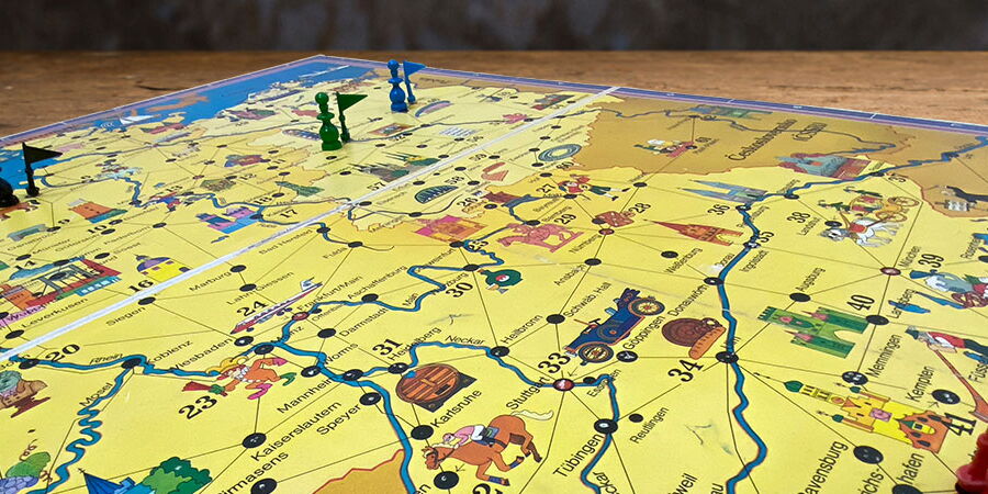 Kleiner Hinweis zum Foto oben: Das Spiel "Deutschlandreise" war in der vordigitalen Zeit ein Hit unter den Brettspielen. Die in dem Bild gezeigte Ausgabe stammt aus dem Jahr 1977, mit den damals noch gültigen Grenzen und Länderbezeichnungen.