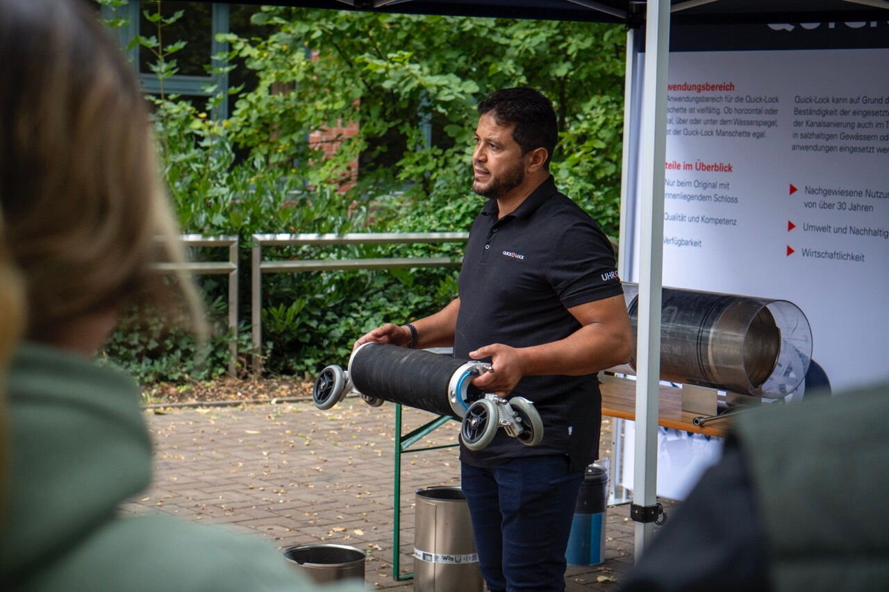 Die rund 83 Auszubildenden im dritten Lehrjahr zur Fachkraft Rohr-, Kanal- und Industrieservice (RKI) erhielten an beiden Tagen direkten Einblick in unterschiedliche grabenlose Sanierungsverfahren. Am ersten Tag lag der Schwerpunkt auf Reparaturverfahren, am zweiten Tag standen die Renovierungstechniken im Vordergrund.