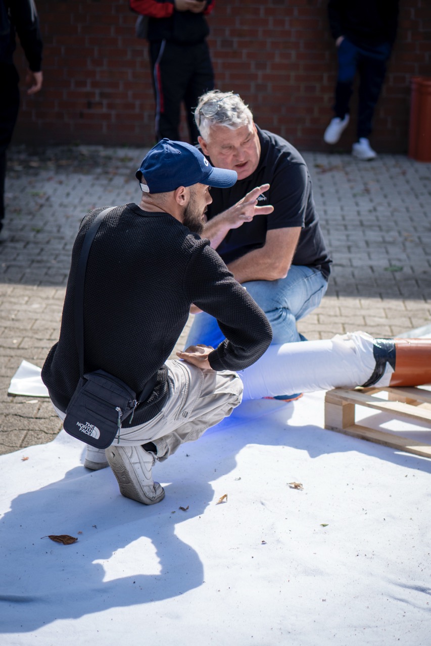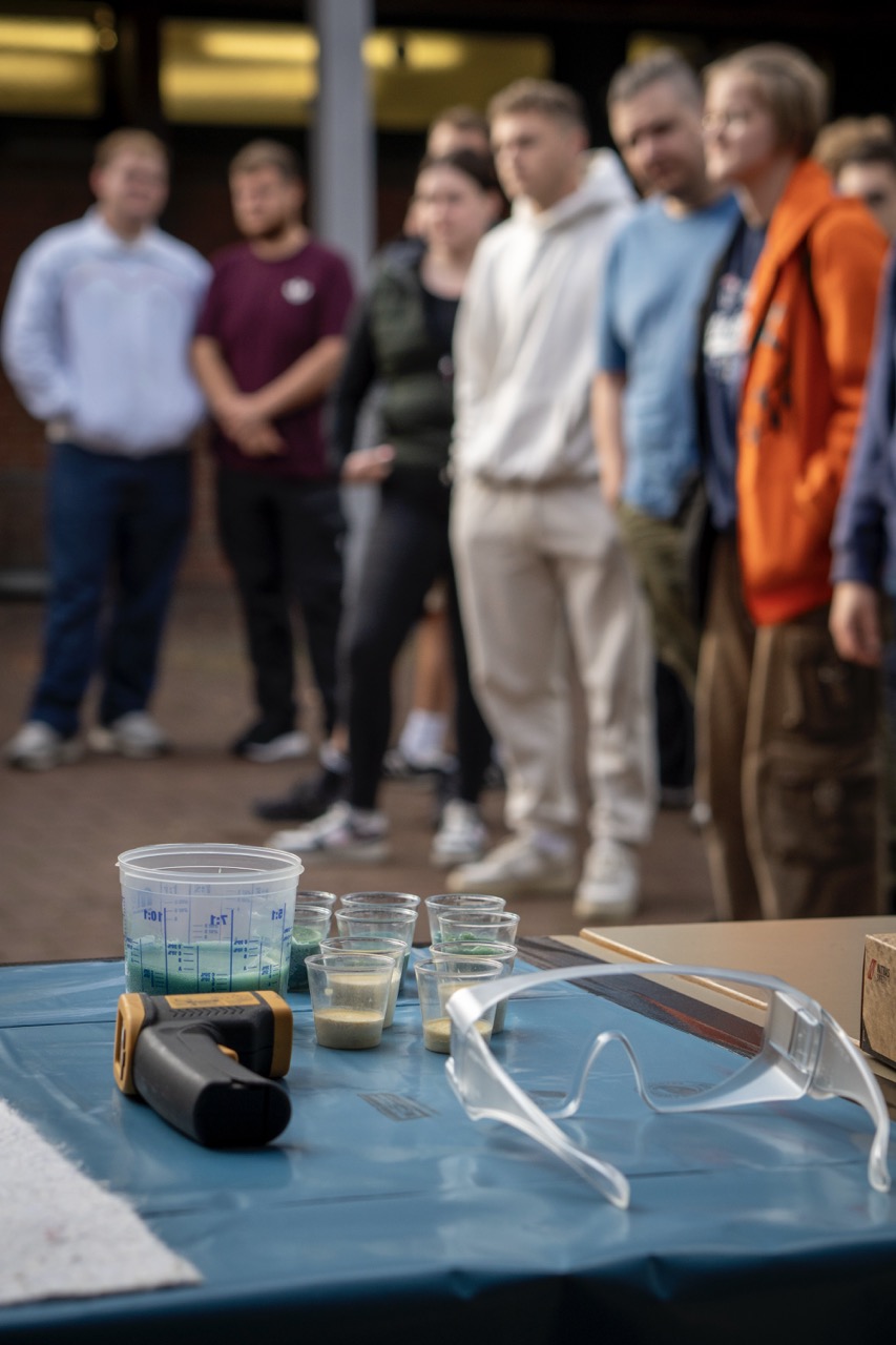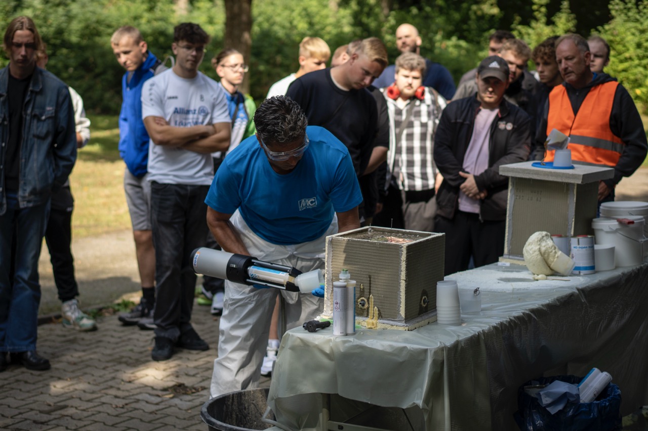 Nach kurzen Vorträgen im Klassenzimmer ging es nach draußen: Auf dem Schulhof präsentierten die Firmen ihre Technik praxisnah – von robotergestützten Verfahren bis hin zu Lining-Systemen. Die Azubis konnten nicht nur zuschauen, sondern vieles selbst ausprobieren und ihre Fragen direkt an die Fachleute stellen.